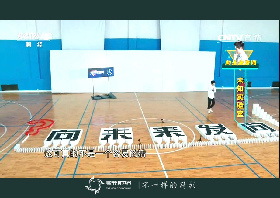 節(jié)目每期以一個(gè)主題詞作為核心線索,嘉賓圍繞主題詞分享關(guān)于未來探索與展望的話題與觀點(diǎn)。在未知實(shí)驗(yàn)室版塊,90后發(fā)明家、天才少年薛來,作為科學(xué)實(shí)驗(yàn)員,用不同大小的多米諾骨牌完成了一個(gè)實(shí)驗(yàn)。實(shí)驗(yàn)5厘米高的小骨牌開始啟動(dòng),呈現(xiàn)“向未來發(fā)文字后,最終觸及50厘米高的大骨牌。通過實(shí)驗(yàn),薛來告訴大家,每個(gè)人所做的每一件事都會(huì)像骨牌一樣一環(huán)一環(huán)的傳遞下去,會(huì)形成巨大的能量,要?jiǎng)?chuàng)造人類美好的未來世界,需要每一個(gè)人的努力。