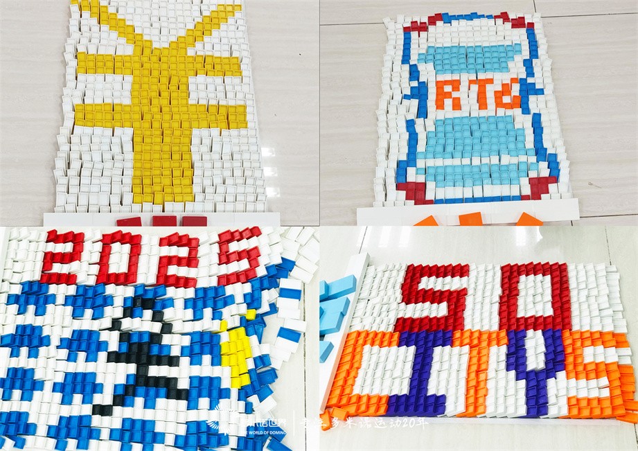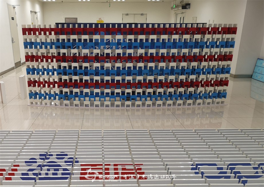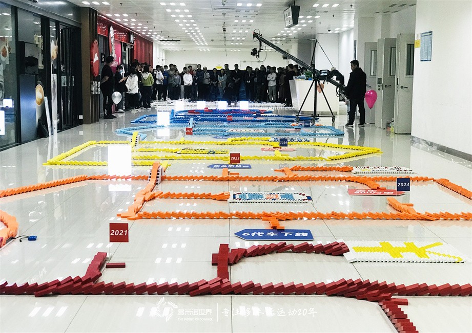 在骨牌搭建的過程中,雖然會(huì)有意外發(fā)生,但是經(jīng)過大家的通力協(xié)作,一幅幅表達(dá)目標(biāo)愿景的畫面一一搭建完成。隨著第一枚多米諾骨牌的觸發(fā),骨牌一路順利前行,一個(gè)個(gè)年代圖卡裝置依次彈開的同時(shí),骨牌畫卷也依次完美呈現(xiàn)。