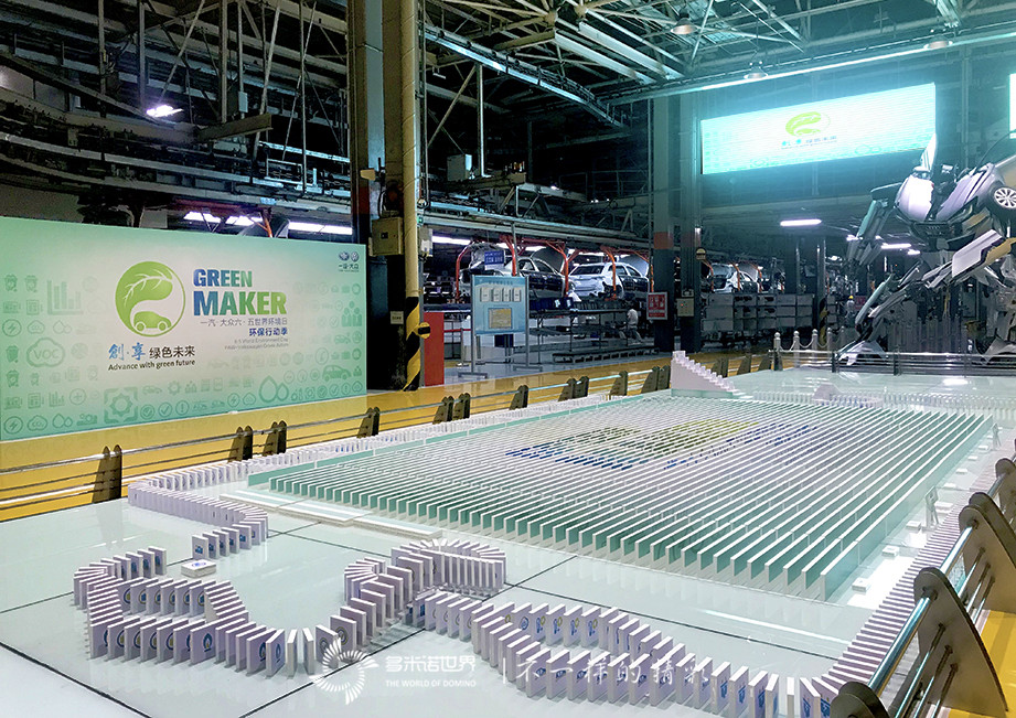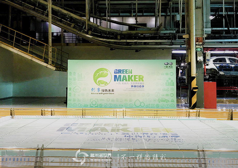本次世界環(huán)境日一汽-大眾的核心活動(dòng)是推出《一汽-大眾環(huán)保體系視覺識(shí)別系統(tǒng)》,活動(dòng)主辦方特別邀請北京的多米諾世界團(tuán)隊(duì)親臨長春,在轎車二廠寶來總裝車間,用7500枚印有環(huán)保體系視覺識(shí)別系統(tǒng)環(huán)保標(biāo)識(shí)的骨牌碼放巨幅多米諾陣列。當(dāng)與會(huì)領(lǐng)導(dǎo)共同啟動(dòng)多米諾骨牌,呈現(xiàn)出《一汽-大眾環(huán)保體系視覺識(shí)別系統(tǒng)》主標(biāo)識(shí)“創(chuàng)?享 綠色未來”,主題畫面的完美呈現(xiàn)標(biāo)志著《一汽-大眾環(huán)保體系視覺識(shí)別系統(tǒng)》的正式發(fā)布,也體現(xiàn)了一汽-大眾依然堅(jiān)持走可持續(xù)發(fā)展之路,在持續(xù)向消費(fèi)者提供質(zhì)量可靠的產(chǎn)品的同時(shí),堅(jiān)持環(huán)保和綠色理念,創(chuàng)建節(jié)能環(huán)保工廠的堅(jiān)定決心。